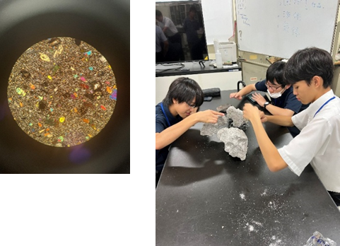 その後、岩石顕微鏡を用いて結晶の違いなどについて学習しました