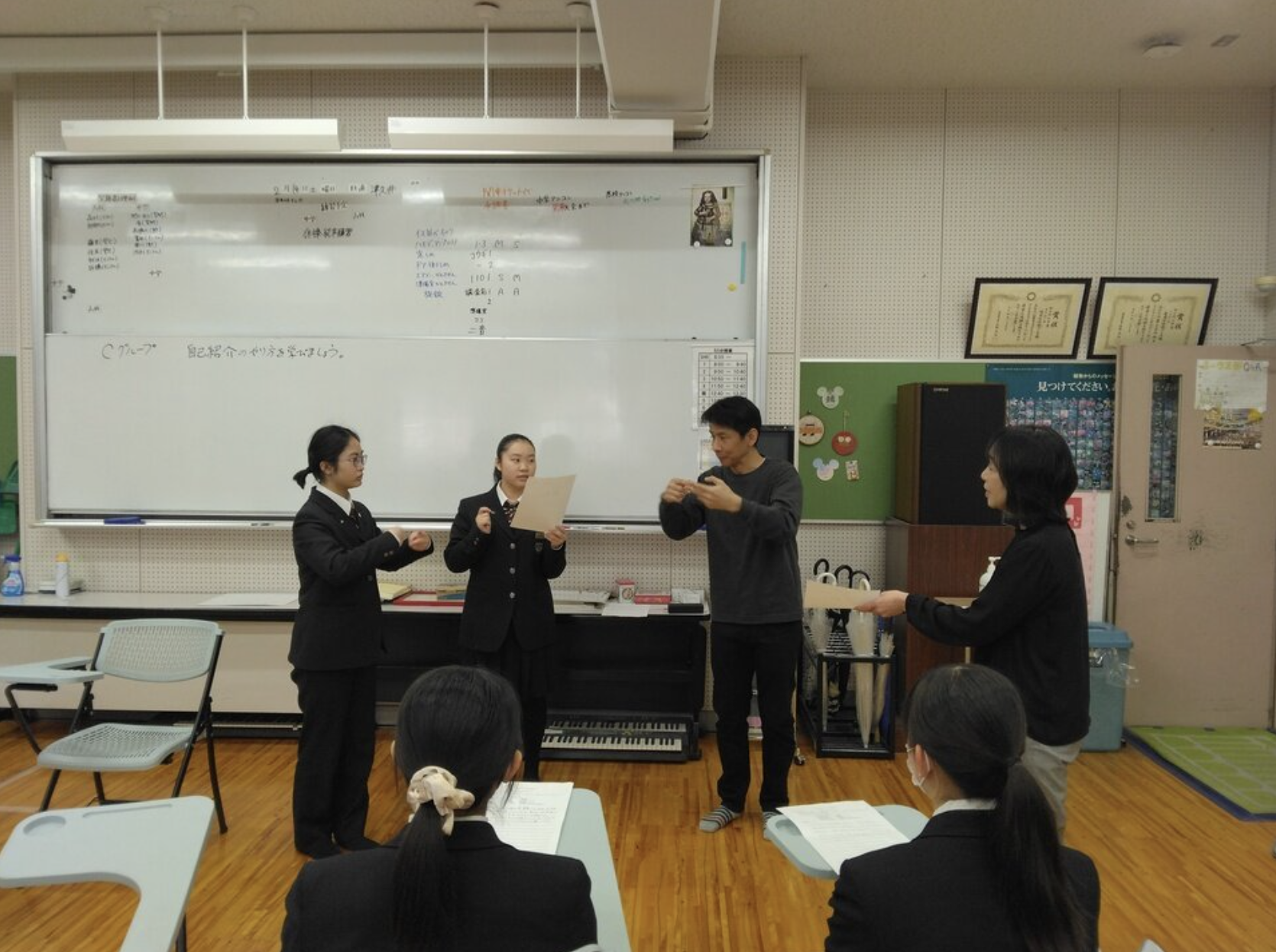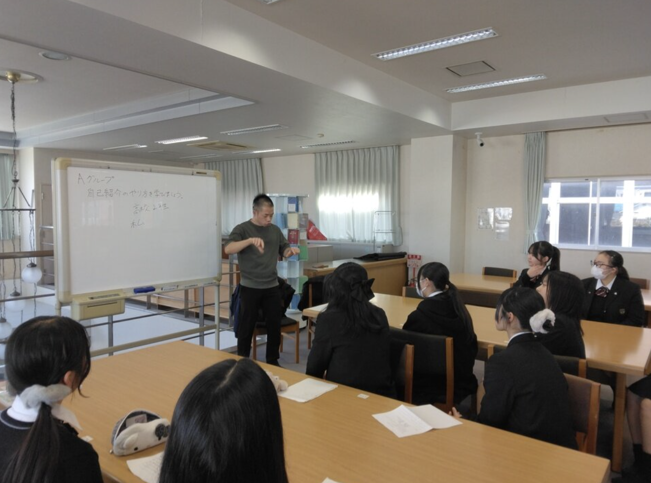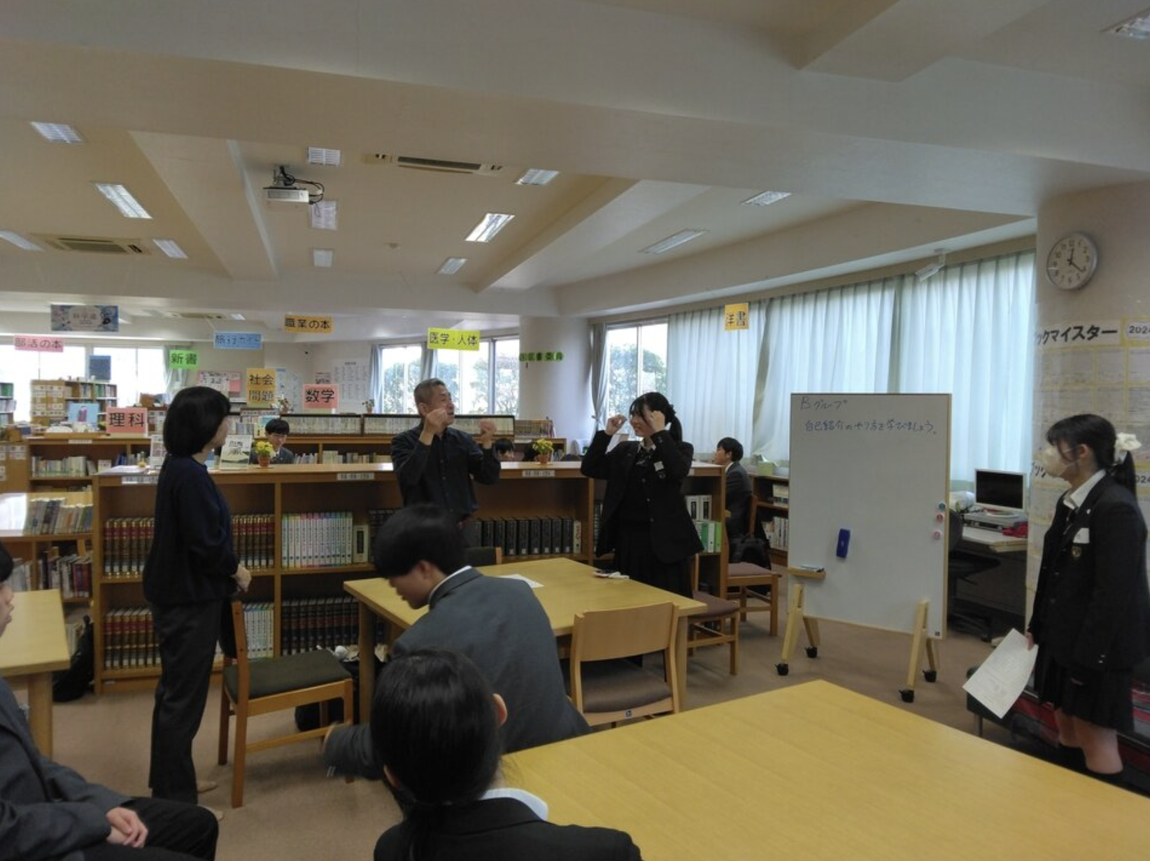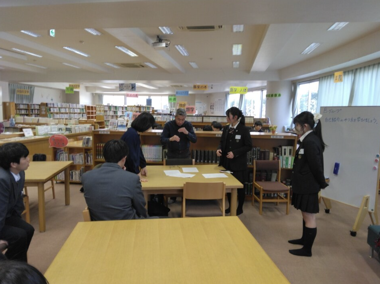 今年は、栄東高校内の土曜AL全体発表会に参加するため、いつもの交流会とはちがい、ろう者に、手話講師となって頂き、グループごとに手話での自己紹介を学ぶことになりました。
