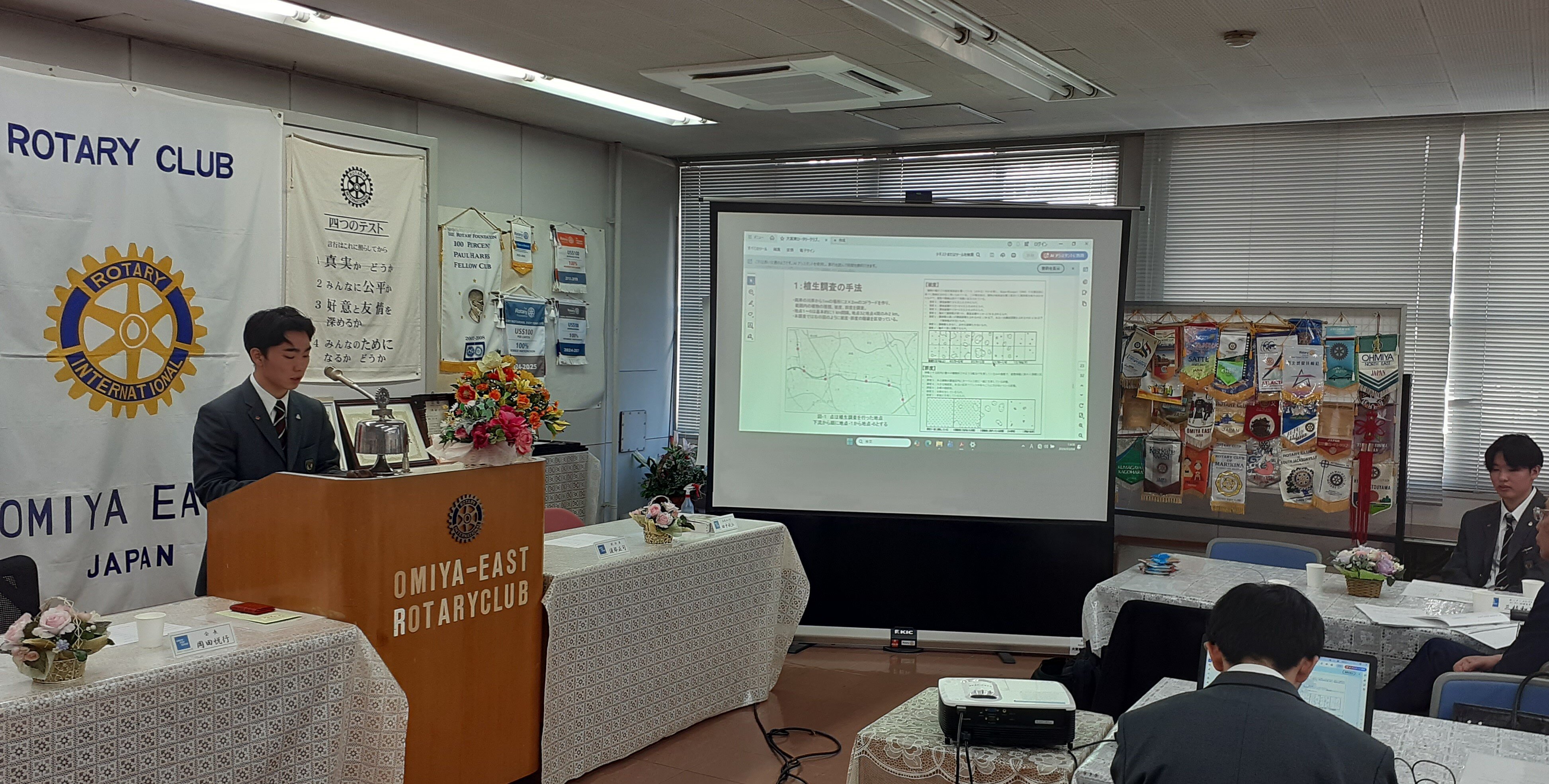 3月4日に武蔵野銀行東大宮支店(会議室)で開催されました大宮東ロータリークラブの例会に、高校生5名が出席をさせて頂きました。「卓話」として、高校2年の平田君・野中君・中森君が2025年度の芝川に関する研究成果を口頭発表させて頂きました。プレゼンに用いた資料と発表の様子(写真)を添付します。